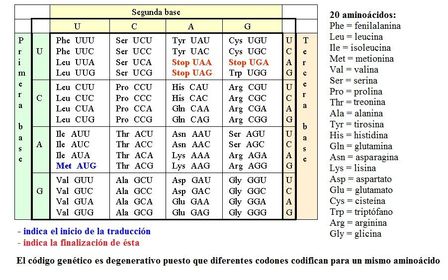El código genético define la relación entre secuencias de tres nucleotidos llamados codones y los a.a. De ese modo, cada codón se corresponde con un a.a.