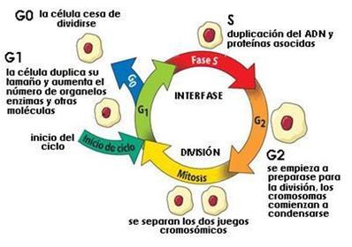 Interfase: Cuando la célula no se está dividiendoFase G1: La célula crece y aumenta tamaño. Pero no crece el material genético. Aumenta el volumen, citoplasma y organelosFase S: multiplica el material genético. 92/ 46'/ 88+4Fase G2: la célula ya está preparada para la división. Se separa de la distribución de sus organelos. Los centriolos aparecen.Fase G0: etapa latente, puede esperar para dividirse o empezar apoptoses.