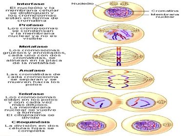 Interfase: Es el tiempo que pasa entre dos mitosis o división del núcleo celularProfase: ADN se condensan y van adquiriendo una forma de cromosoma. Desaparecen la membrana nuclear y el nucléolo. Los centríolos se ubican en puntos opuestos en la célula y comienzan a formar unos finos filamentos que en conjunto se llaman huso mitótico.Metafase: las fibras del huso mitótico se unen a cada centrómero de los cromosomas. Estos se ordenan en el plano ecuatorial de la célula, cada uno unido a su duplicado.Anafase: los centrómeros se duplican por lo tanto, cada duplicado del cromosoma se separa y es atraído a su correspondiente polo, a través de las fibras del huso. Telofase: Se desintegra el huso mitótico, la membrana nuclear y el nucléolo reaparecen, los nuevos cromosomas pierden su forma definida y se transforman en hebras o largos filamentos de ADN. Terminada la telofase se forman dos núcleos idénticos en relación con la cantidad y calidad de ADN que posee cada célula nueva.