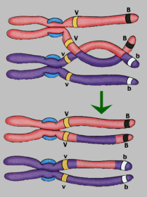 Proceso que ocurre en meiosis e incluye la ruptura de un cromosoma materno y paterno (homologos), el intercambio de las correspondientes secciones de ADN y su unión al otro cromosoma.