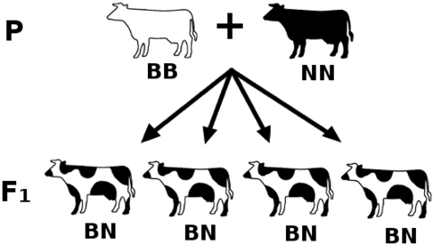 PRIMERA LEY DE MENDEL (Ley de uniformidad):Establece que si se cruzan dos razas puras (homocigotos) para un determinado carácter, los descendientes (híbridos) de la primera generación serán todos iguales entre sí (igual fenotipo e igual genotipo) e iguales (en fenotipo) a uno de los progenitores.No es una ley de transmisión de caracteres, como ya dijimos, sino de manifestación de dominancia frente a la no manifestación de los caracteres recesivos. LOS PADRES.