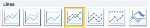 Gráficos de líneas:Muestran datos continuos en l tiempo, establecidos a una escala común e idoneos para mostrar tendencias en intervalos iguales.Los datos de valor van en el eje vertical y los datos de categoría en el eje horizontal.