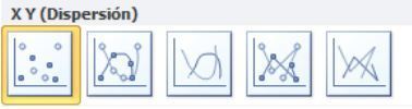 Gráficos de tipo XY (Dispersión): Muestran la relación entre los valores númericos de varias series de datos o trazan dos grupos de números como una serie de coordenadas XY.Tiene dos ejes de valores y muesra un conjunto de datos númericos en el eje horizontal (X) y otro en el vertical (Y).Combina estos valores en puntos de datos únicos y los muestran en inervalos irregulares o agrupaciones.Se utilizan para mostrar y comparar valores númericos.