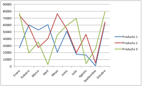 En un gráfico de líneas se pueden trazar datos que se organizan en columnas o filas de una hoja de cálculo. Los gráficos de líneas muestran datos continuos en el tiempo, establecidos frente a una escala común y, por tanto, son idóneos para mostrar tendencias en datos a intervalos iguales. En un gráfico de líneas, los datos de categoría se distribuyen uniformemente en el eje horizontal y todos los datos de valor se distribuyen uniformemente en el eje vertical.