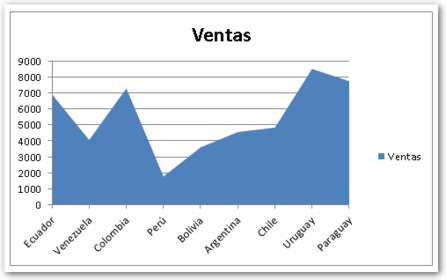En un gráfico de área se pueden trazar datos que se organizan en columnas o filas de una hoja de cálculo. Los gráficos de área destacan la magnitud del cambio en el tiempo y se pueden utilizar para enfocar la atención en el valor total de una tendencia.