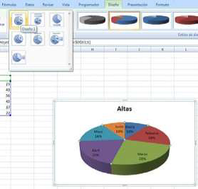En los gráficos circulares se pueden plantear dos cuestiones interesantes, y son la expresión de los datos y el destacar un sector del gráfico.Puedesincluirlos como valores o mejor como porcentajes. Paraello selecciona la serie de datos y observa cómo cambiala ficha superior, en la que verás un grupo de Diseñode gráfico (a veces hay que hacer un doble clic). Elige el Diseño 1, que ofrece rótulos y porcentajes y así lograrás tu objetivo.