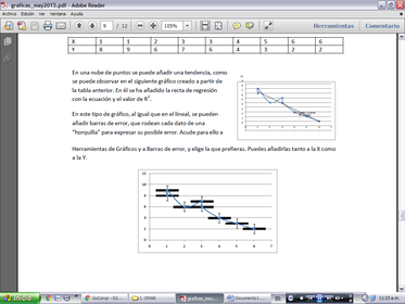 En este tipo de gráfico, al igual que en el lineal, se pueden añadir barras de error, que rodean cada dato de una“horquilla” para expresar su posible error. Acude para ello aHerramientas de Gráficos y a Barras de error, y elige la que prefieras. Puedes añadirlas tanto a la X comoa la Y.