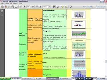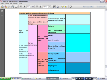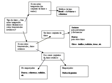 No todos los tipos de gráficos son adecuados para un conjunto concreto de datos. Algunos de ellos sóloconjunto de datos: si son series temporales o no, si interviene una o varias variablesvalen para un fin, y otros se adaptan a varias clases de datos. Para tomar la decisión de cuál usardebemos tener en cuenta, por un lado, el tipo de medida usada y, por otro, las características del conjunto de datos