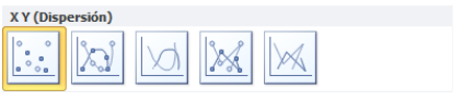 Gráficos de tipo XY (Dispersión): En un gráfico de tipo XY (dispersión) se pueden trazar datos organizados en columnas y filas de una hoja de cálculo. Los gráficos de dispersión muestran la relación entre los valores numéricos de varias series de datos o trazan dos grupos de números como una serie de coordenadas XY. Un gráfico de dispersión tiene dos ejes de valores y muestra un conjunto de datos numéricos en el eje horizontal (eje X) y otro en el eje vertical (eje Y). Combina estos valores en puntos de datos únicos y los muestra en intervalos irregulares o agrupaciones. Los gráficos de dispersión se utilizan por lo general para mostrar y comparar valores numéricos, por ejemplo datos científicos, estadísticos y de ingeniería