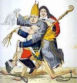 Caption: : Caricatura que representa al pueblo oprimido por el Rey, el Clero y la Nobleza.