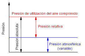 La presion relativa: es la presión en relación con la atmósfera (el 0 de la escala es la presión atmosférica a nivel del mar). Se conoce como presión absoluta a la presión real que se ejerce sobre un punto dado. El concepto está vinculado a la presión atmosférica y la presión manométrica.Presión absoluta = presión relativa + presión de la atmósfera