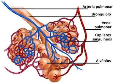 Caption: : En los alvéolos del pulmón se lleva a cabo el intercambio de oxígeno y de dióxido de carbono, proceso que se denomina hematosis