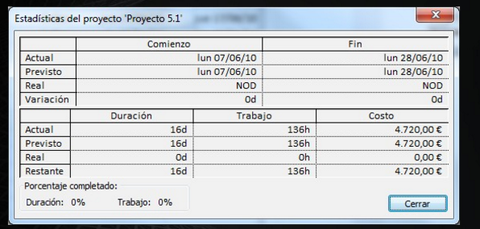 LA INFORMACIÓN QUE SE INGRESE AL PROGRAMA SE PUDE VISUALIZAR EN LA BARRA DE ESTADISTICAS Y SE PODRÁ IDENTIFICAR CADA PROCESOS DE LAS TAREAS ASIGNADAS CUAL ES EL TIEMPO FALTANTE Y LA CANTIDAD DE RECURSOS QUE LLEVA EN EL MOMENTO.ADEMAS DE ESTAR VINCULADOS PODEMOS EVIDENCIAR QUE EN EL RETRASO DE UNA DE LAS TAREAS EL PROYEECTO SE PROLONGARA INMEDIATAMENTE