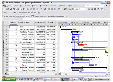 EN ESTE PROGRAMA PODEMOS REALIZAR LA PLANEACIÓN DEL PROYECTO MEDIANTE UNA HERRAMIENTA YA SE AUTOMÁTICA O MANUALMANUAL SE DEBE ESCRIBIR LA TAREA DIRECTAMENTE Y ASIGNARLE LA TIEMPO DE DURACIÓN Y FECHA DE INICIOAUTOMÁTICA SOLAMENTE SE COLOCA LA DESCRIPCIÓN DE LA TAREA Y SE ASIGNA ÚNICAMENTE LA DURACIÓN DE LA FASE O TAREA Y AUTOMÁTICAMENTE EN EL CRONO GRAMA QUEDA REGISTRADOADEMAS D ESTA PLANEACIÓN PODEMOS VINCULAR LAS TAREAS ES DECIR QUE VAN ENLAZADAS Y PODER VER EN QUE MOMENTO SE DEBE INICIAR LA SIGUIENTE FASE Y ASÍ LOGRAR EL CUMPLIMIENTO OPORTUNO DE LOS PROYECTOS TENIENDO EN CUENTA LA ASIGNACIÓN DE HITOS QUE FACILITA LA INTERPRETACIÓN DE LA TAREA EN SU FINAL.