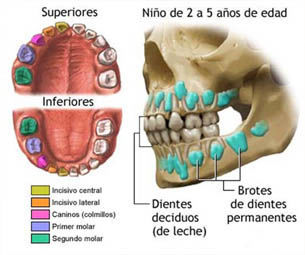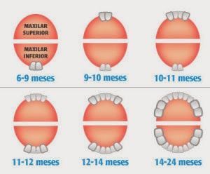 Los dientes temporales empiezan a formarse ya a las 6 o 7 semanas de vida intrauterina, se van desarrollando dentro de los huesos maxilares y normalmente empiezan a hacer erupción en la boca del niño alrededor de los 6 meses de edad.Generalmente, a los 3 años de edad los 20 dientes temporales han hecho su erupción. Cada diente debe salir a una determinada edad, aunque variaciones de 6 meses a 1 año en la fecha de aparición pueden considerarse completamente normales.