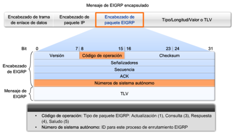 Cada mensaje EIGRP incluye el encabezado. Los campos importantes para nuestro análisis incluyen el campo Código de operación y el campo Número de sistema autónomo. El Código de operación especifica el tipo de paquete EIGRP: º Saludo º Actualización º Consulta º Respuesta