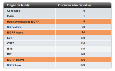 Como se vio en el Capítulo 3, "Introducción a los protocolos de enrutamiento dinámicos", la distancia administrativa (AD) constituye la confiabilidad (o preferencia) del origen de la ruta. EIGRP tiene una distancia administrativa predeterminada de 90 para las rutas internas y de 170 para las rutas importadas desde un origen externo, como rutas predeterminadas. Cuando se lo compara con otros protocolos de gateway interior (IGP), EIGRP es el que IOS de Cisco prefiere porque cuenta con la distancia administrativa más baja.