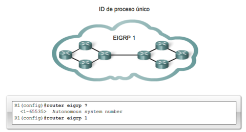 EIGRP y OSPF usan el ID de proceso para representar una instancia del protocolo de enrutamiento respectivo que se ejecuta en el router. Aunque EIGRP hace referencia al parámetro como un número de "sistema autónomo", en realidad funciona como un ID de proceso. El número no se encuentra asociado con ningún número de sistema autónomo analizado previamente y se le puede asignar cualquier valor de 16 bits. Router(config)#router eigrp autonomous-system