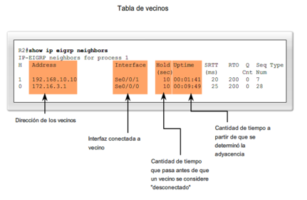 Antes de poder intercambiar cualquier paquete EIGRP entre los routers, EIGRP debe descubrir primero a sus vecinos. Los vecinos de EIGRP son otros routers que ejecutan EIGRP en redes compartidas conectadas directamente.Los routers EIGRP descubren vecinos y establecen adyacencias con los routers vecinos mediante el paquete de saludo. En la mayoría de las redes, los paquetes de saludo EIGRP se envían cada 5 segundos. En las redes de accesos múltiples sin broadcast (NBMA) y de punto múltiple, como X.25, Frame Relay e interfaces ATM con enlaces de acceso de T1 (1.544 Mbps) o más lentos, los Hello son unicast cada 60 segundos. Un router EIGRP supone que mientras reciba los paquetes de saludo de un vecino, el vecino y sus rutas permanecen viables.
