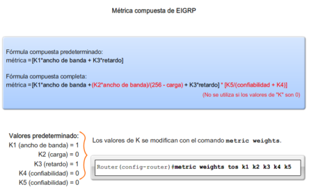 EIGRP utiliza los siguientes valores en su métrica compuesta para calcular la ruta preferida hacia una red: º Ancho de banda. º Retardo. º Confiabilidad. º Carga.Los valores K predeterminados pueden cambiarse con el comando del router EIGRP:Router(config-router)#metric weights tos k1 k2 k3 k4 k5