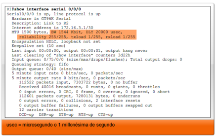 La métrica del ancho de banda (1544 kbit) es un valor estático utilizado por algunos protocolos de enrutamiento, como EIGRP y OSPF, para calcular su métrica de enrutamiento. El ancho de banda se muestra en kbit (kilobits). La mayoría de las interfaces seriales utilizan el valor de ancho de banda predeterminado de 1544 kbit o 1 544 000 bps (1544 Mbps). Éste es el ancho de banda de una conexión T1. Sin embargo, algunas interfaces seriales utilizan otro valor de ancho de banda predeterminado. Siempre verifique el ancho de banda con el comando show interface.
