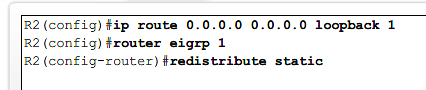 El uso de una ruta estática hacia 0.0.0.0/0 como ruta predeterminada no depende de ningún protocolo de enrutamiento. La ruta estática predeterminada "quad zero" se puede utilizar con cualquier protocolo de enrutamiento actualmente admitido. La ruta estática predeterminada generalmente se configura en el router que tiene una conexión con una red fuera del dominio de enrutamiento EIGRP