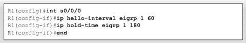 Los intervalos de saludo y los tiempos de espera se configuran por interfaz y no tienen que coincidir con otros routers EIGRP para establecer adyacencias. El comando para configurar un intervalo de saludo distinto es:Router(config-if)#ip hello-interval eigrp as-number seconds