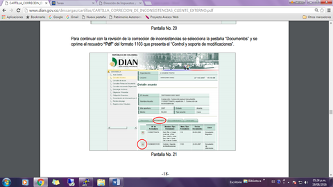 Caption: : Para continuar con la revisión de la corrección de inconsistencias se selecciona la pestaña “Documentos” y se oprime el recuadro “Pdf” del formato 1103 que presenta el “Control y soporte de modificaciones”