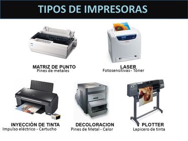 DE MATRIZ DE PUNTOS: Se produce al golpear una aguja o una rueda de caracteres contra una cinta con tintaIMPRESORA DE CHORRO DE TINTA: Son baratas de mantener y fáciles de operar. Imprimen utilizando uno o varios cartuchos de tinta diferentes como: Cían, Magenta, Amarillo y Negro.IMPRESORA LÁSER: Uno de sus rasgos más importantes es la calidad que se obtiene en las impresionesPLOTTERS: Es utilizada para realizar toda clase de proyectos publicitarios tales como: Gigantografías, Cartelería comercial y publicitaria en tamaños extra grandesDECOLORACION: Su resolución y velocidad es mucho más baja