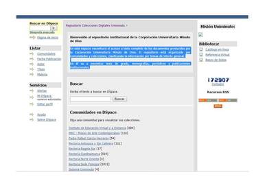 En este lugar se localiza el acceso a texto completo de los documentos producidos por la Corporación Universitaria Minuto de Dios. El repositorio está organizado por comunidades y colecciones, clasificando la información por temas de interés general.Aca podemos encontrar tesis de grado, monografías, periódicos y publicaciones institucionales.