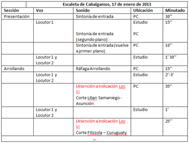 escaleta del programa     48'Entada                          30"salida                            30"cortinilla salida               10"cortinilla regreso             10"entrevistas                      ?spots                            20"menciones                     20"cápsulas                         1'