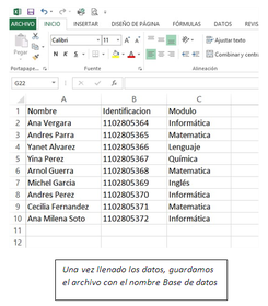 2.- ABRIMOS MICROSOFT EXCEL 2013 -----> CREAMOS LA BASE DE DATOS CON LA INFORMACIÓN QUE VAMOS A COMBINAR EN LA CARTA, (UNA VEZ LLENADO LOS DATOS GUARDAR EL ARCHIVO ).