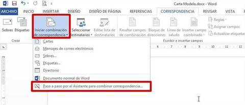 3.- NUEVAMENTE VOLVAMOS AL ARCHIVO DE WORD, VAMOS A LA PESTAÑA CORRESPONDENCIA, DENTRO DE LA PESTAÑA SELECCIONAMOS INICIAR COMBINACIÓN DE CORRESPONDENCIA Y LUEGO SELECCIONAMOS LA OPCIÓN PASO A PASO POR EL ASISTENTE PARA COMBINAR CORRESPONDENCIA.
