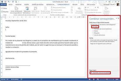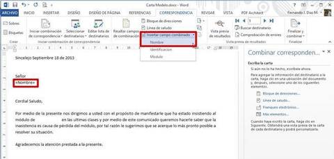 PASOS:1.- ABRIMOS MICROSOFT WORD 2013, ESCRIBIMOS LA CARTA DEJANDO LOS ESPACIOS NECESARIOS Y/O SUFICIENTES PARA REALIZAR LA COMBINACIÓN. (GUARDAR EL ARCHIVO)