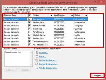 7.- DEBEMOS VER LA LISTA DE LOS DATOS QUE ESTÁN EN EL ARCHIVO DE EXCEL Y DAMOS ACEPTAR. SI REALIZAMOS TODOS LOS PASOS HASTA AQUÍ EN ESTE PUNTO DEBEMOS VER EN LA PANTALLA EL NOMBRE DEL ARCHIVO.