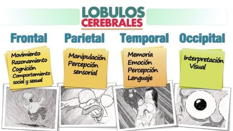 El cerebro humano puede dividirse en dos partes más o menos simétricas denominadas hemisferios. Cada hemisferio puede dividirse en 4 lóbulos diferentes: