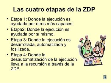 Vygotski (1980), citado por Vallejo, García y Pérez (1999), definió la Zona de Desarrollo Próximo (ZDP) como la distancia entre “el nivel de desarrollo real del niño tal y como puede ser determinado a partir de la resolución independiente de problemas” y el nivel más elevado de “desarrollo potencial y tal como es determinado por la resolución de problemas bajo la guía del adulto o en colaboración con iguales más capaces”.Entonces puedo concluir que la ZDP son los puntos máximos de las capacidades de las personas, en este caso de los niños específicamente quienes se encuentran en la etapa de desarrollo intelectual y física, ambos aspectos son tomados en cuenta para concretar este camino de acción con actividades reales a actividades potenciales.