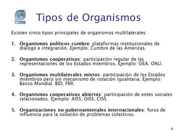 Es una organización que se encuentra conformado por 3 o mas naciones, donde su principal misión es trabajar conjuntamente en las problemáticas y aspectos relacionados con los países que integran la organización.Se establecen acuerdos .