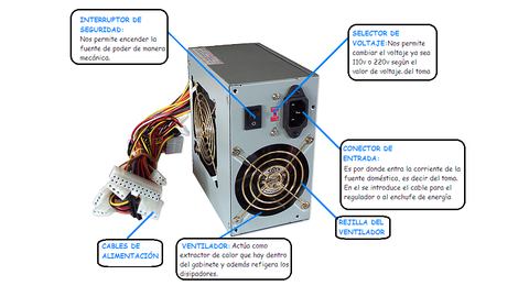 La fuente de alimentación de un ordenador es la encargada de proporcionar la energía eléctrica dentro de la CPU. Para que los elementos de un ordenador funcionen correctamente necesitan un nivel de tensión determinado que es proporcionado por la fuente de alimentación. Estos niveles pueden ser de +5V, -5V, +12V y -12V.Tras proporcionar los niveles de tensión adecuados (a partir de enchufes), éstos son transformados y enviados a los elementos mediante conectores.