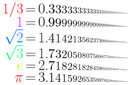 Los números racionales periódicos, de los cuales sus decimales tienen un número ilimitado de cifras.