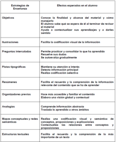 - OBJETIVOS-RESUMEN-ORGANIZADOR PREVIO-ILUSTRACIONES-ANALOGÍAS-PREGUNTAS INTERCALADAS-PISTAS TOPOGRÁFICAS Y DISCURSIVAS-MAPAS CONCEPTUALES Y REDES SEMÁNTICAS-USO DE ESTRUCTURAS TEXTUALES-