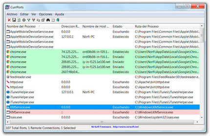 ¿Cómo conocer aplicaciones que usan la red sin nuestro conocimiento? Es casi imposible manualmente configurar todas las aplicaciones que usamos para impedir que usen nuestra conexión, pero puedes detectarlas fácilmente.Para eso lo más sencillo es usar la herramienta CurrentPorts, es una aplicación gratuita que no es necesario instalar, solo ejecutarla.Muestra todas las conexiones establecidas y las aplicaciones que utilizan la red.En la columna Estado muestra las aplicaciones que están a la escucha y las que tienen una conexión establecida, por lo tanto están usando parte del ancho de banda de la conexión.