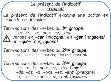 Present de l'indicatif Conjugaison:sujet+verb conjugué au present+complèment. Ex: Je mange des pommes