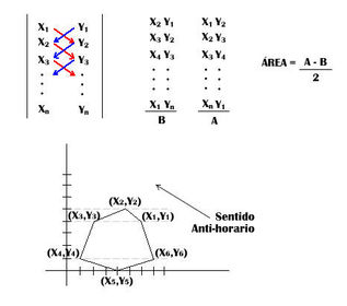 Para hallar el área de cualquier polígono teniendo las coordenadas de todos sus vértices se aplica la siguiente fórmula: