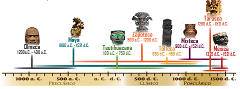 Horizonte postclásico: los cambios políticos que durante esta etapa se vivieron, mucho tuvieron su origen en invasiones de pueblos nómadas del norte de México, que absorbieron los conocimientos de sus antecesores formando pueblos donde se abandonó la teocracia que dominó durante el clásico, dando paso al militarismo y la formación de grandes estados como el mexica. Este periodo donde la cultura en Mesoamérica estaba en su máximo apogeo se dio del 900 d.C. hasta el 1521 d.C.