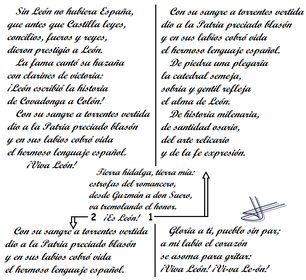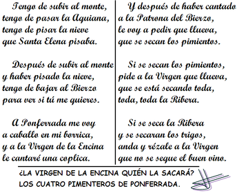 A Ponferrada me voya caballo en mi borrica,[ y a la Virgen de la Encinale cantaré una coplica. ] [BIS] Y después de haber cantadoa la Patrona del Bierzo,[ le voy a pedir que llueva,que se secan los pimientos. ] [BIS] Si se secan los pimientos,pide a la Virgen que llueva,[ que se está secando toda,toda, toda la Ribera. ] [BIS] Si se seca la Riberay se secaran los trigos,[ anda y rézale a la Virgenque no se seque el buen vino. ] [BIS] ¿LA VIRGEN DE LA ENCINA [QUIÉN LA SACARÁ?] LOS CUATRO PIMENTEROS [DE PONFERRADA.]