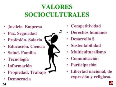- Valores socio-culturales: Estos son principios que enfocan en el comportamiento de cada individuo dentro de una determinada sociedad; con el correr de la historia estos han ido cambiando variando de acuerdo a la sociedad.
