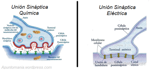 sinapsis eléctricas y químicas:Una sinapsis eléctrica es una sinapsis en la que la transmisión entre la primera neurona y la segunda neurona no se produce por la secreción de un neurotransmisor, como sucede en las sinapsis químicas, sino por el paso de iones de una célula a otra a través de «uniones gap»