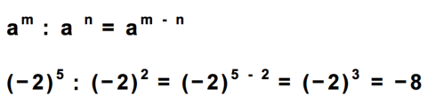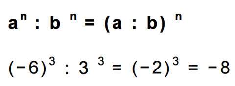 División de potencias con el mismo exponente y diferente baseEl exponente permanece igual, después se dividen las bases y al final se eleva el exponente