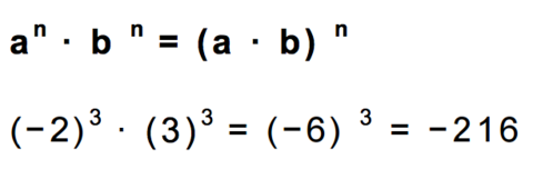 Producto de potencias con el mismo exponente y diferente baseEl exponente permanece igual, después se multiplican las bases y al final se eleva el exponente